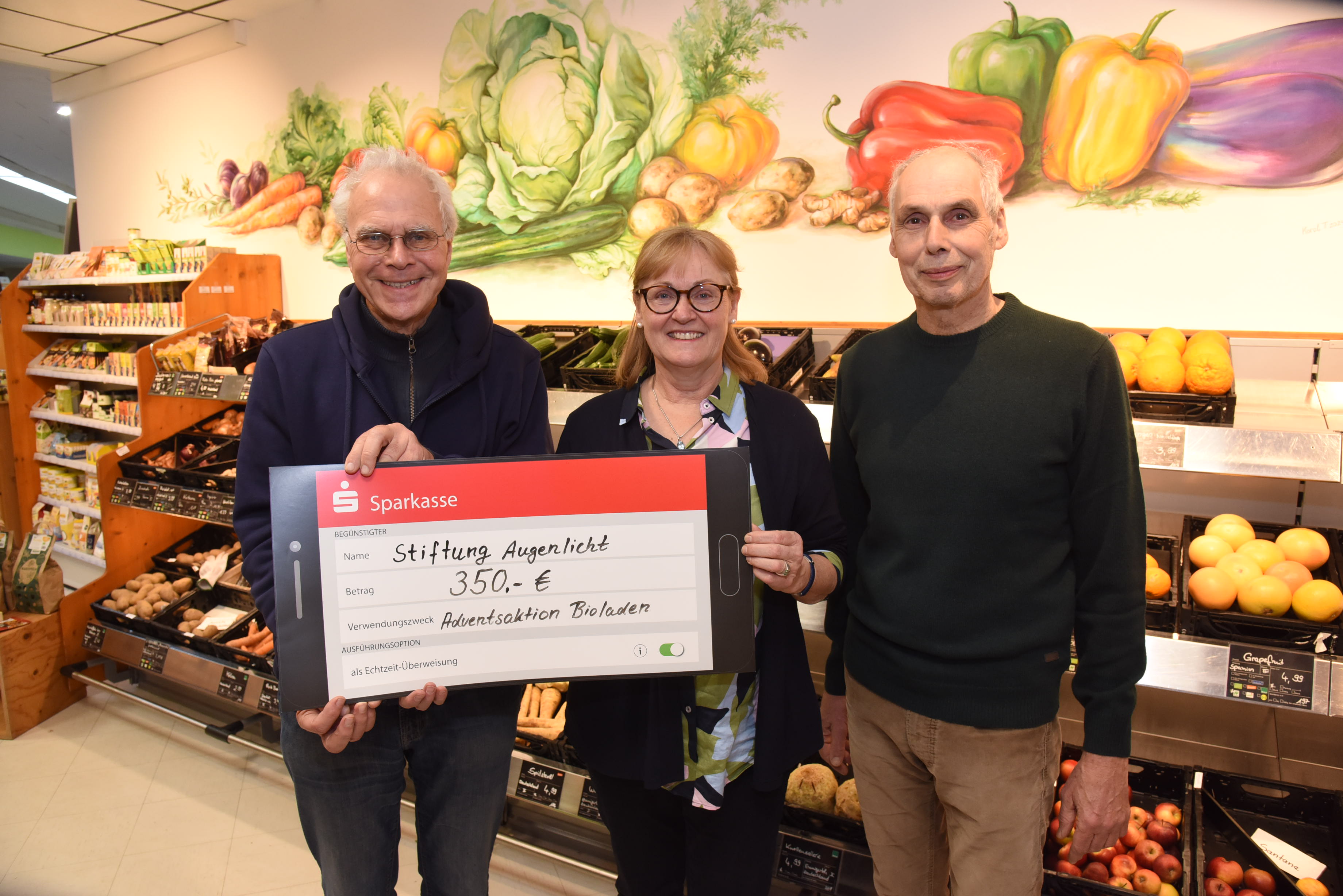 350,00 Euro kamen an den Adventssamstagen 2025 im Bioladen Grasgrün an der Nordstraße bei einer Spendenaktion zugunsten der Stiftung Augenlicht zusammen. Mit dem Geld werden demnächst in Tansania Augenoperationen durchgeführt; Menschen, die sich sonst die Operation nicht leisten können, erhalten durch die Eingriffe ihr Augenlicht zurück.